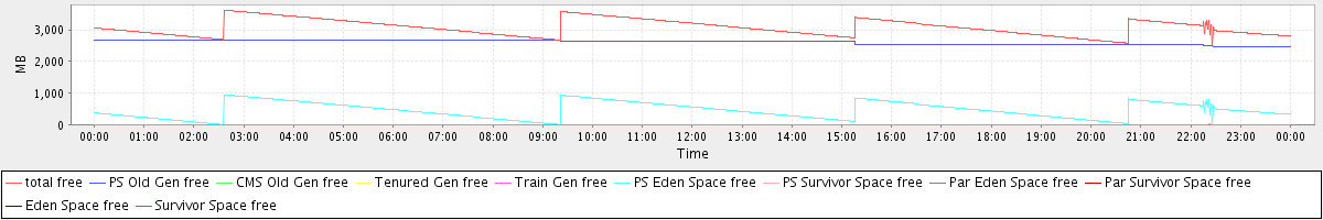 avg(total free) = 3072.95 avg(PS Old Gen free) = 2616.80 avg(CMS Old Gen free) = 0.00 avg(Tenured Gen free) = 0.00 avg(Train Gen free) = 0.00 avg(PS Eden Space free) = 456.09 avg(PS Survivor Space free) = 0.07 avg(Par Eden Space free) = 0.00 avg(Par Survivor Space free) = 0.00 avg(Eden Space free) = 0.00 avg(Survivor Space free) = 0.00