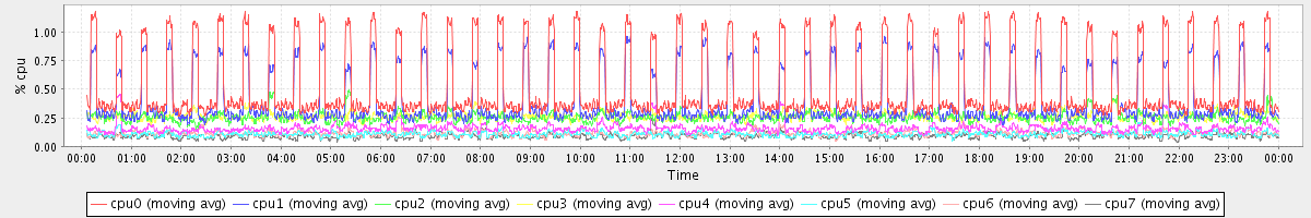 avg(cpu0) = 0.52 avg(cpu1) = 0.40 avg(cpu2) = 0.25 avg(cpu3) = 0.26 avg(cpu4) = 0.16 avg(cpu5) = 0.11 avg(cpu6) = 0.12 avg(cpu7) = 0.09
