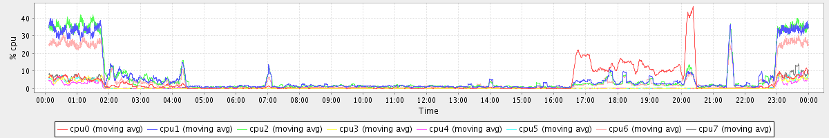 avg(cpu0) = 1.38 avg(cpu1) = 1.05 avg(cpu2) = 0.91 avg(cpu3) = 0.44 avg(cpu4) = 0.33 avg(cpu5) = 0.33 avg(cpu6) = 0.64 avg(cpu7) = 0.32