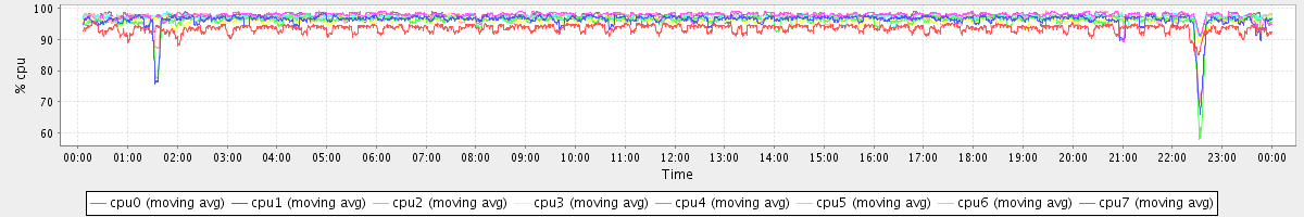 avg(cpu0) = 93.47 avg(cpu1) = 96.17 avg(cpu2) = 95.96 avg(cpu3) = 96.02 avg(cpu4) = 97.65 avg(cpu5) = 97.00 avg(cpu6) = 97.11 avg(cpu7) = 97.40