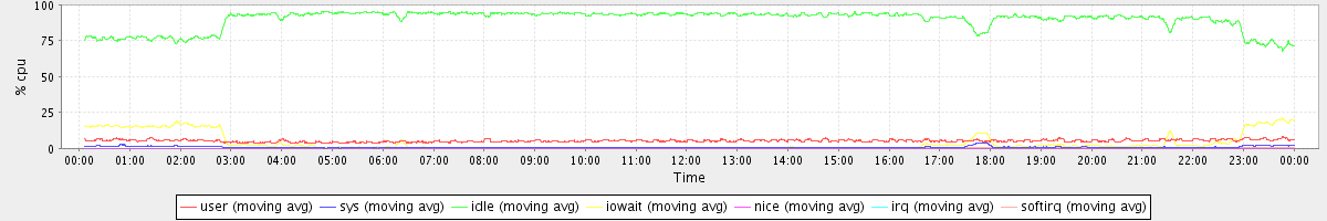 avg(user) = 5.32 avg(sys) = 0.80 avg(idle) = 89.74 avg(iowait) = 3.92 avg(nice) = 0.00 avg(irq) = 0.03 avg(softirq) = 0.19