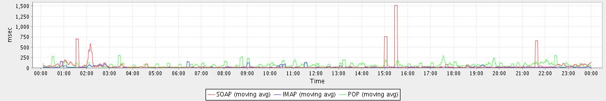 max(GetMsgRequest) = 25.00 max(GetAppointmentRequest) = 52.00 max(SearchRequest) = 85.00 max(SearchConvRequest) = 25.00 max(MsgActionRequest.move) = 26.00 max(MsgActionRequest.update) = 33.00 max(MsgActionRequest.delete) = 138.00 max(SetAppointmentRequest) = 25.00 max(NoOpRequest) = 43.00 max(GetFolderRequest) = 223.00