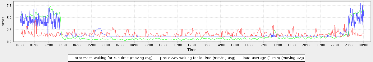 avg(processes waiting for run time) = 0.59 avg(processes waiting for io time) = 0.86 avg(load average (1 min)) = 1.47