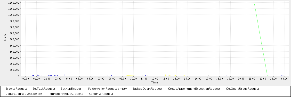 avg(BrowseRequest) = 2798.00 avg(SetTaskRequest) = 314.00 avg(BackupRequest) = 584881.00 avg(FolderActionRequest.empty) = 2651.76 avg(BackupQueryRequest) = 972.25 avg(CreateAppointmentExceptionRequest) = 374.69 avg(GetQuotaUsageRequest) = 3203.00 avg(ConvActionRequest.delete) = 580.45 avg(ItemActionRequest.delete) = 368.60 avg(SendMsgRequest) = 484.95