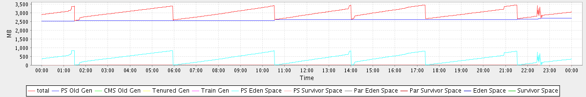 avg(total) = 2999.48 avg(PS Old Gen) = 2587.47 avg(CMS Old Gen) = 0.00 avg(Tenured Gen) = 0.00 avg(Train Gen) = 0.00 avg(PS Eden Space) = 392.31 avg(PS Survivor Space) = 19.70 avg(Par Eden Space) = 0.00 avg(Par Survivor Space) = 0.00 avg(Eden Space) = 0.00 avg(Survivor Space) = 0.00
