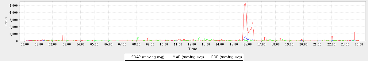 avg(SyncGalRequest) = 538.37 avg(ImportContactsRequest) = 2993.00 avg(BackupRequest) = 432616.00 avg(FolderActionRequest.empty) = 1992.49 avg(SendInviteReplyRequest) = 403.53 avg(BackupQueryRequest) = 872.60 avg(CreateAppointmentExceptionRequest) = 333.45 avg(GetQuotaUsageRequest) = 3215.00 avg(ConvActionRequest.delete) = 366.40 avg(SendMsgRequest) = 416.78