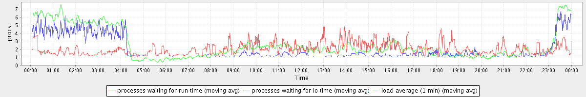 avg(processes waiting for run time) = 1.25 avg(processes waiting for io time) = 1.33 avg(load average (1 min)) = 2.51