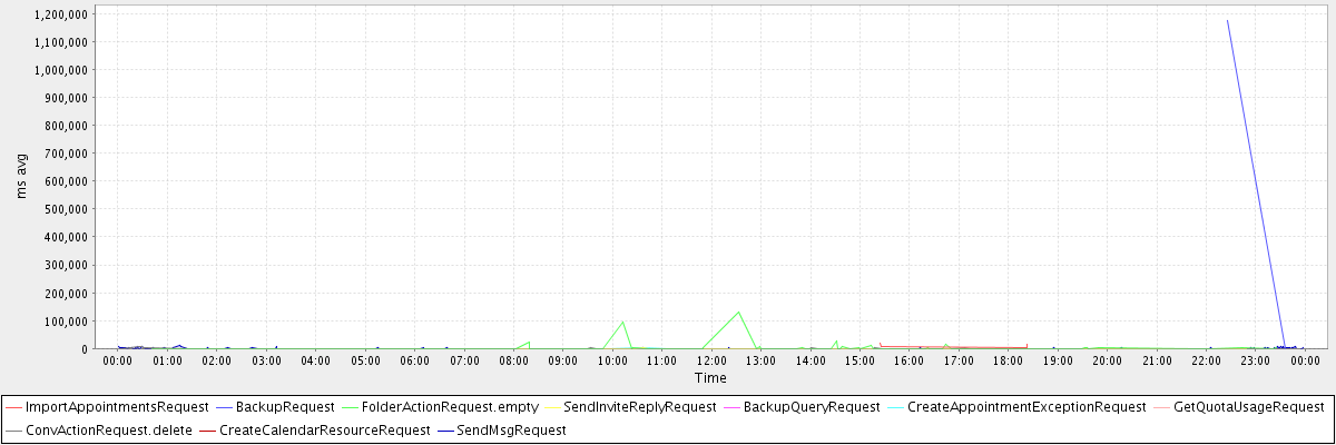 avg(ImportAppointmentsRequest) = 12314.50 avg(BackupRequest) = 587506.50 avg(FolderActionRequest.empty) = 4935.05 avg(SendInviteReplyRequest) = 294.51 avg(BackupQueryRequest) = 926.60 avg(CreateAppointmentExceptionRequest) = 289.40 avg(GetQuotaUsageRequest) = 3312.00 avg(ConvActionRequest.delete) = 565.50 avg(CreateCalendarResourceRequest) = 335.25 avg(SendMsgRequest) = 380.40