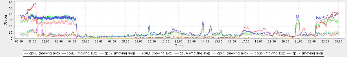 avg(cpu0) = 1.31 avg(cpu1) = 0.25 avg(cpu2) = 0.24 avg(cpu3) = 0.09 avg(cpu4) = 0.08 avg(cpu5) = 0.08 avg(cpu6) = 0.19 avg(cpu7) = 0.08