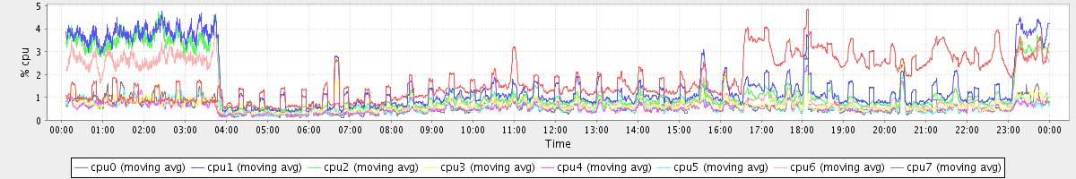 avg(cpu0) = 1.20 avg(cpu1) = 0.20 avg(cpu2) = 0.21 avg(cpu3) = 0.07 avg(cpu4) = 0.06 avg(cpu5) = 0.07 avg(cpu6) = 0.15 avg(cpu7) = 0.06