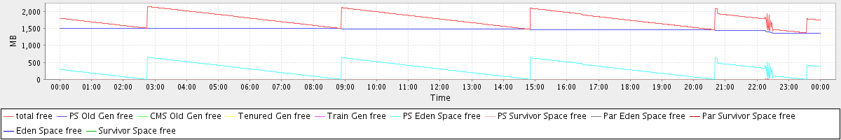 avg(total free) = 1767.25 avg(PS Old Gen free) = 1471.50 avg(CMS Old Gen free) = 0.00 avg(Tenured Gen free) = 0.00 avg(Train Gen free) = 0.00 avg(PS Eden Space free) = 294.91 avg(PS Survivor Space free) = 0.85 avg(Par Eden Space free) = 0.00 avg(Par Survivor Space free) = 0.00 avg(Eden Space free) = 0.00 avg(Survivor Space free) = 0.00