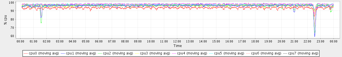 avg(cpu0) = 93.47 avg(cpu1) = 95.81 avg(cpu2) = 95.85 avg(cpu3) = 95.96 avg(cpu4) = 97.67 avg(cpu5) = 97.28 avg(cpu6) = 97.12 avg(cpu7) = 97.35