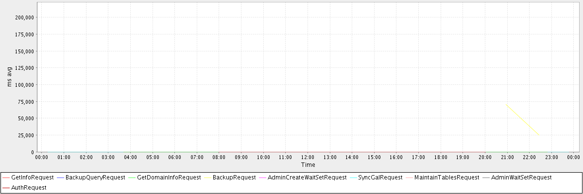 avg(GetInfoRequest) = 1.50 avg(BackupQueryRequest) = 742.00 avg(GetDomainInfoRequest) = 0.21 avg(BackupRequest) = 48116.00 avg(AdminCreateWaitSetRequest) = 0.00 avg(SyncGalRequest) = 170.08 avg(MaintainTablesRequest) = 212324.00 avg(AdminWaitSetRequest) = 0.11 avg(AuthRequest) = 46.50