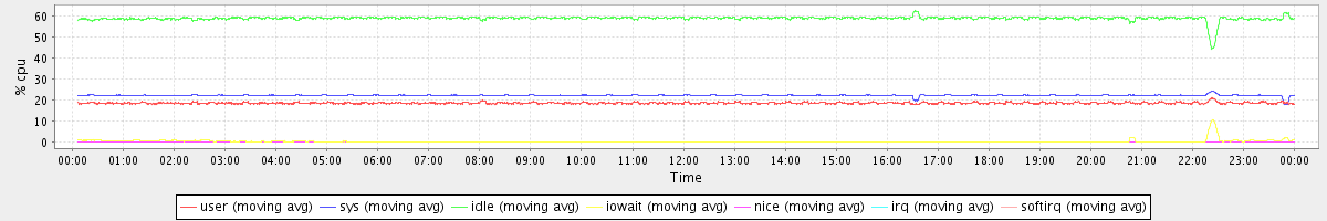 avg(user) = 18.52 avg(sys) = 22.25 avg(idle) = 58.95 avg(iowait) = 0.27 avg(nice) = 0.00 avg(irq) = 0.00 avg(softirq) = 0.00
