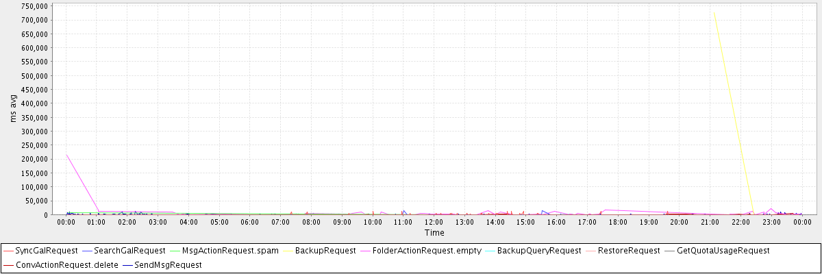 avg(SyncGalRequest) = 305.65 avg(SearchGalRequest) = 572.19 avg(MsgActionRequest.spam) = 1507.25 avg(BackupRequest) = 363846.50 avg(FolderActionRequest.empty) = 7324.43 avg(BackupQueryRequest) = 656.14 avg(RestoreRequest) = 415343.00 avg(GetQuotaUsageRequest) = 3208.00 avg(ConvActionRequest.delete) = 371.92 avg(SendMsgRequest) = 395.65
