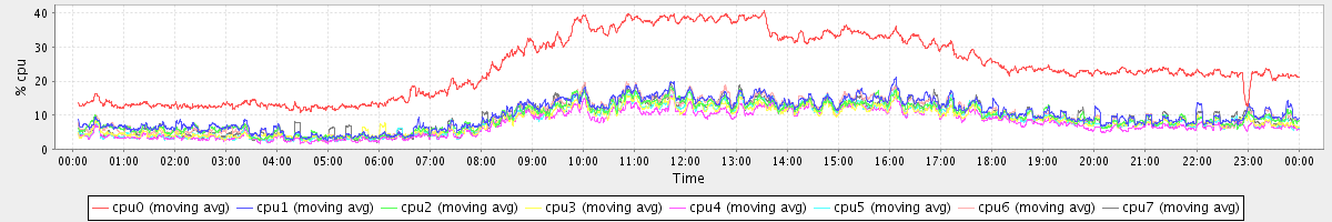 avg(cpu0) = 24.21 avg(cpu1) = 10.18 avg(cpu2) = 9.33 avg(cpu3) = 8.44 avg(cpu4) = 7.45 avg(cpu5) = 8.46 avg(cpu6) = 9.57 avg(cpu7) = 9.20