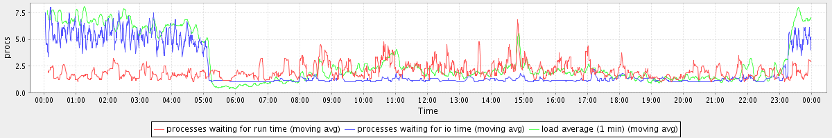 avg(processes waiting for run time) = 1.23 avg(processes waiting for io time) = 1.57 avg(load average (1 min)) = 2.93