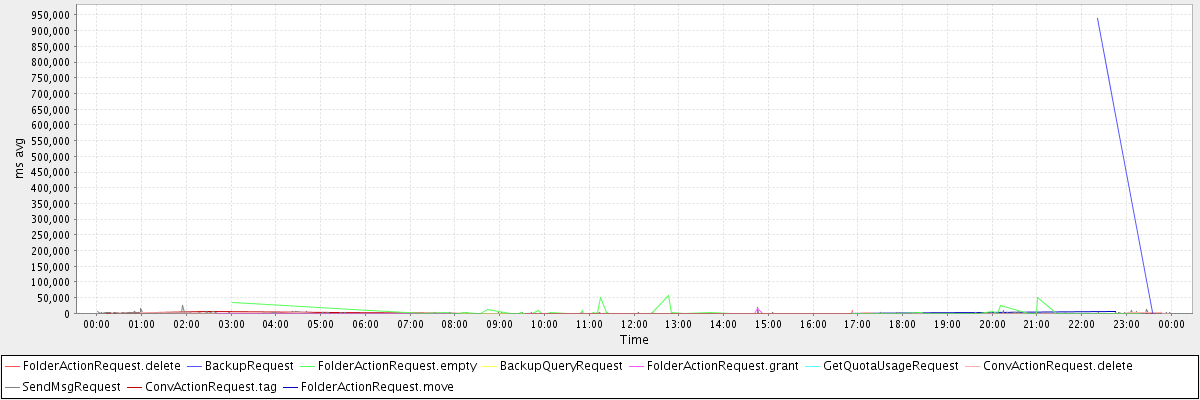 avg(FolderActionRequest.delete) = 525.19 avg(BackupRequest) = 469658.50 avg(FolderActionRequest.empty) = 3887.67 avg(BackupQueryRequest) = 856.17 avg(FolderActionRequest.grant) = 560.24 avg(GetQuotaUsageRequest) = 3578.00 avg(ConvActionRequest.delete) = 377.20 avg(SendMsgRequest) = 466.35 avg(ConvActionRequest.tag) = 370.38 avg(FolderActionRequest.move) = 650.45