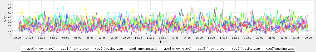 avg(cpu0) = 17.18 avg(cpu1) = 18.68 avg(cpu2) = 26.32 avg(cpu3) = 24.47 avg(cpu4) = 19.62 avg(cpu5) = 26.24 avg(cpu6) = 21.59 avg(cpu7) = 24.04