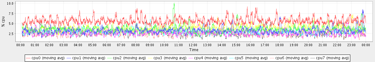 avg(cpu0) = 0.55 avg(cpu1) = 0.40 avg(cpu2) = 0.30 avg(cpu3) = 0.31 avg(cpu4) = 0.21 avg(cpu5) = 0.16 avg(cpu6) = 0.14 avg(cpu7) = 0.12