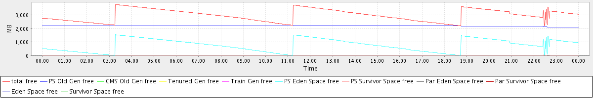 avg(total free) = 2982.14 avg(PS Old Gen free) = 2207.83 avg(CMS Old Gen free) = 0.00 avg(Tenured Gen free) = 0.00 avg(Train Gen free) = 0.00 avg(PS Eden Space free) = 772.83 avg(PS Survivor Space free) = 1.47 avg(Par Eden Space free) = 0.00 avg(Par Survivor Space free) = 0.00 avg(Eden Space free) = 0.00 avg(Survivor Space free) = 0.00