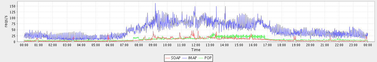Host zm08.stanford.edu: Mailboxd: Request Rate by Client Protocol
