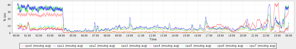 avg(cpu0) = 2.43 avg(cpu1) = 1.96 avg(cpu2) = 1.73 avg(cpu3) = 1.00 avg(cpu4) = 0.84 avg(cpu5) = 0.88 avg(cpu6) = 1.44 avg(cpu7) = 0.82