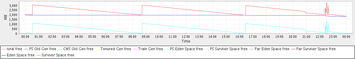 avg(total free) = 2466.54 avg(PS Old Gen free) = 1939.30 avg(CMS Old Gen free) = 0.00 avg(Tenured Gen free) = 0.00 avg(Train Gen free) = 0.00 avg(PS Eden Space free) = 526.84 avg(PS Survivor Space free) = 0.40 avg(Par Eden Space free) = 0.00 avg(Par Survivor Space free) = 0.00 avg(Eden Space free) = 0.00 avg(Survivor Space free) = 0.00