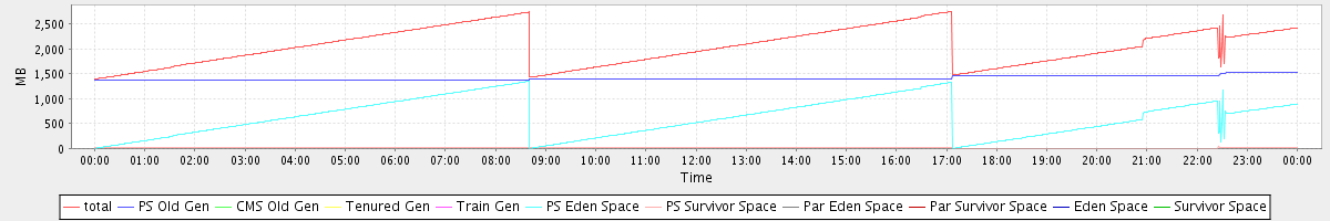 avg(total) = 2057.37 avg(PS Old Gen) = 1411.48 avg(CMS Old Gen) = 0.00 avg(Tenured Gen) = 0.00 avg(Train Gen) = 0.00 avg(PS Eden Space) = 627.66 avg(PS Survivor Space) = 18.23 avg(Par Eden Space) = 0.00 avg(Par Survivor Space) = 0.00 avg(Eden Space) = 0.00 avg(Survivor Space) = 0.00