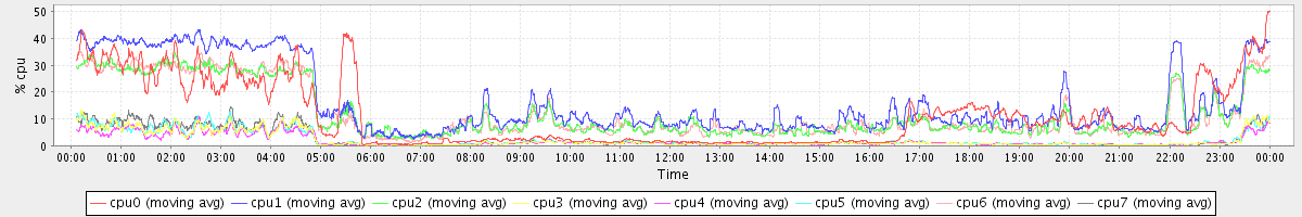 avg(cpu0) = 2.01 avg(cpu1) = 0.42 avg(cpu2) = 0.36 avg(cpu3) = 0.20 avg(cpu4) = 0.18 avg(cpu5) = 0.19 avg(cpu6) = 0.31 avg(cpu7) = 0.20