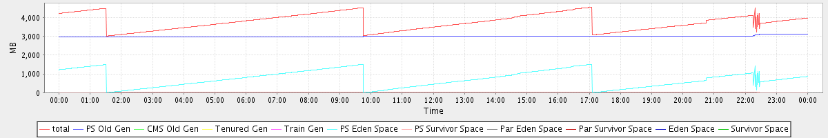 avg(total) = 3767.97 avg(PS Old Gen) = 3004.25 avg(CMS Old Gen) = 0.00 avg(Tenured Gen) = 0.00 avg(Train Gen) = 0.00 avg(PS Eden Space) = 729.62 avg(PS Survivor Space) = 34.11 avg(Par Eden Space) = 0.00 avg(Par Survivor Space) = 0.00 avg(Eden Space) = 0.00 avg(Survivor Space) = 0.00