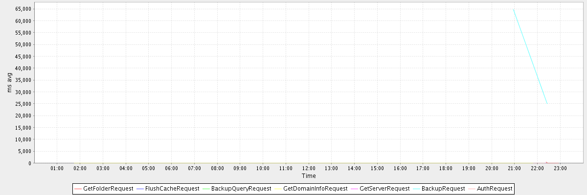 avg(GetFolderRequest) = 71.00 avg(FlushCacheRequest) = 46.00 avg(BackupQueryRequest) = 714.00 avg(GetDomainInfoRequest) = 0.17 avg(GetServerRequest) = 46.50 avg(BackupRequest) = 44819.00 avg(AuthRequest) = 23.20