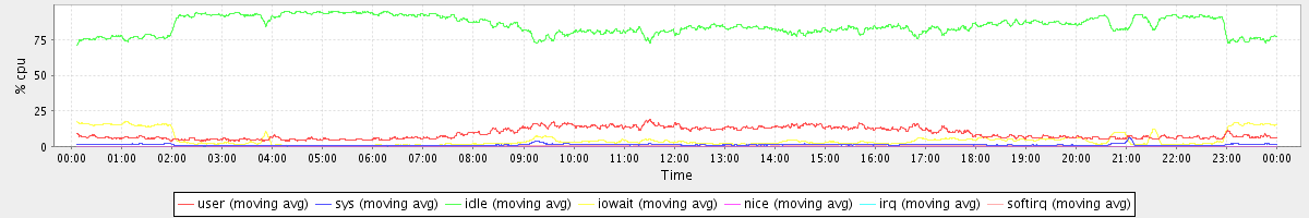 avg(user) = 9.01 avg(sys) = 1.07 avg(idle) = 85.09 avg(iowait) = 4.55 avg(nice) = 0.00 avg(irq) = 0.03 avg(softirq) = 0.25