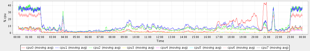 avg(cpu0) = 1.10 avg(cpu1) = 0.22 avg(cpu2) = 0.20 avg(cpu3) = 0.08 avg(cpu4) = 0.08 avg(cpu5) = 0.08 avg(cpu6) = 0.17 avg(cpu7) = 0.09