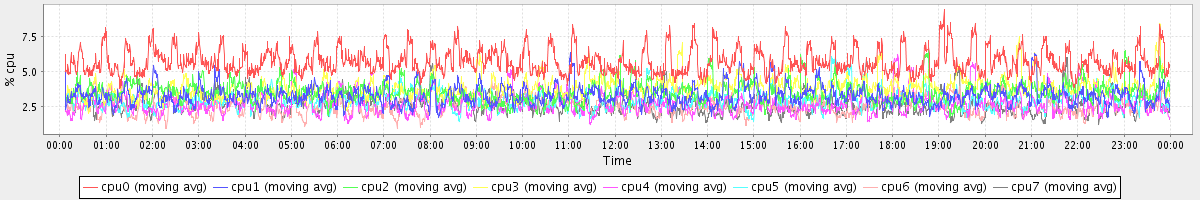 avg(cpu0) = 5.73 avg(cpu1) = 3.32 avg(cpu2) = 3.56 avg(cpu3) = 3.88 avg(cpu4) = 2.72 avg(cpu5) = 3.00 avg(cpu6) = 2.59 avg(cpu7) = 2.67