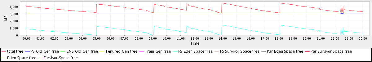 avg(total free) = 3771.31 avg(PS Old Gen free) = 3110.05 avg(CMS Old Gen free) = 0.00 avg(Tenured Gen free) = 0.00 avg(Train Gen free) = 0.00 avg(PS Eden Space free) = 639.91 avg(PS Survivor Space free) = 21.35 avg(Par Eden Space free) = 0.00 avg(Par Survivor Space free) = 0.00 avg(Eden Space free) = 0.00 avg(Survivor Space free) = 0.00