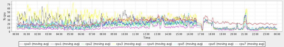 avg(cpu0) = 0.88 avg(cpu1) = 0.37 avg(cpu2) = 0.34 avg(cpu3) = 0.18 avg(cpu4) = 0.21 avg(cpu5) = 0.21 avg(cpu6) = 0.31 avg(cpu7) = 0.17