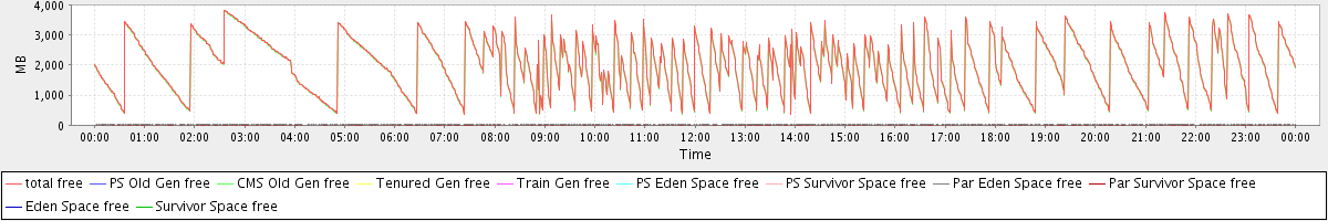 avg(total free) = 1990.56 avg(PS Old Gen free) = 0.00 avg(CMS Old Gen free) = 1970.54 avg(Tenured Gen free) = 0.00 avg(Train Gen free) = 0.00 avg(PS Eden Space free) = 0.00 avg(PS Survivor Space free) = 0.00 avg(Par Eden Space free) = 19.95 avg(Par Survivor Space free) = 0.06 avg(Eden Space free) = 0.00 avg(Survivor Space free) = 0.00