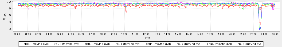 avg(cpu0) = 93.83 avg(cpu1) = 96.21 avg(cpu2) = 95.87 avg(cpu3) = 95.96 avg(cpu4) = 97.29 avg(cpu5) = 96.91 avg(cpu6) = 96.97 avg(cpu7) = 97.25