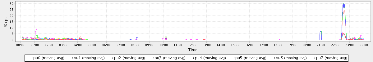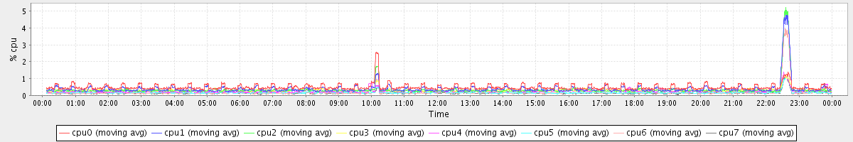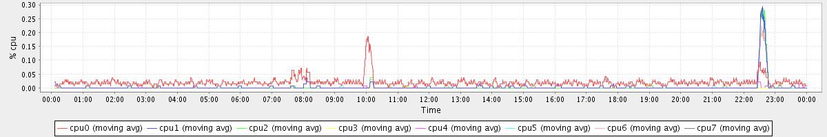 avg(cpu0) = 0.49 avg(cpu1) = 0.40 avg(cpu2) = 0.33 avg(cpu3) = 0.31 avg(cpu4) = 0.25 avg(cpu5) = 0.17 avg(cpu6) = 0.18 avg(cpu7) = 0.14