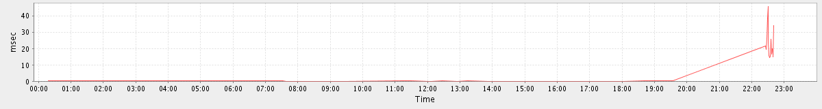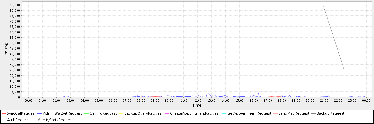 avg(SyncGalRequest) = 190.03 avg(AdminWaitSetRequest) = 83.84 avg(GetInfoRequest) = 51.12 avg(BackupQueryRequest) = 225.00 avg(CreateAppointmentRequest) = 121.50 avg(GetAppointmentRequest) = 35.50 avg(SendMsgRequest) = 239.00 avg(BackupRequest) = 54684.00 avg(AuthRequest) = 35.50 avg(ModifyPrefsRequest) = 261.00