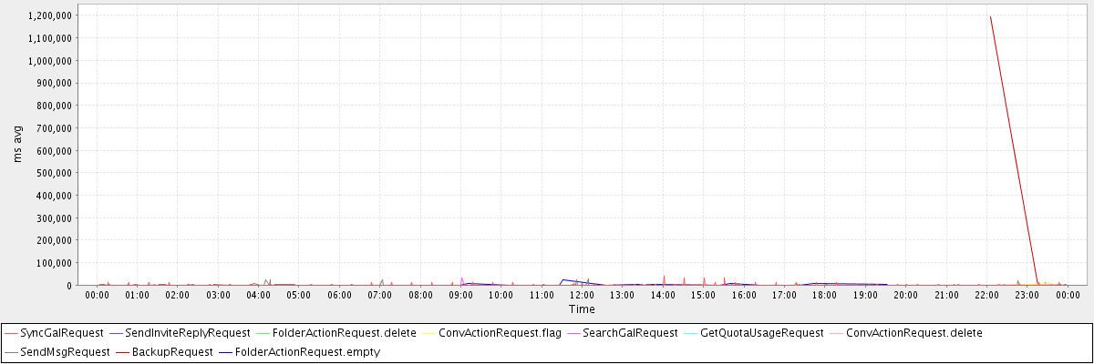avg(SyncGalRequest) = 593.38 avg(SendInviteReplyRequest) = 624.50 avg(FolderActionRequest.delete) = 1216.67 avg(ConvActionRequest.flag) = 644.00 avg(SearchGalRequest) = 3787.38 avg(GetQuotaUsageRequest) = 3264.00 avg(ConvActionRequest.delete) = 541.69 avg(SendMsgRequest) = 603.70 avg(BackupRequest) = 596963.00 avg(FolderActionRequest.empty) = 1884.76