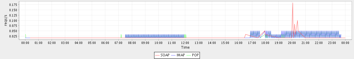 max(GetInfoRequest) = 2.00 max(GetAccountRequest) = 2.00 max(BackupQueryRequest) = 1.00 max(GetDomainInfoRequest) = 5.00 max(DismissCalendarItemAlarmRequest) = 1.00 max(GetContactsRequest) = 1.00 max(MaintainTablesRequest) = 1.00 max(AuthRequest) = 4.00 max(SearchConvRequest) = 1.00 max(SearchRequest) = 3.00