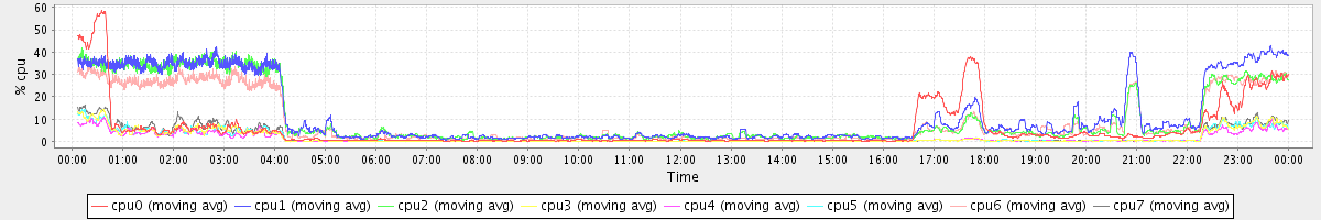 avg(cpu0) = 5.71 avg(cpu1) = 11.93 avg(cpu2) = 10.45 avg(cpu3) = 1.67 avg(cpu4) = 1.28 avg(cpu5) = 1.65 avg(cpu6) = 8.91 avg(cpu7) = 2.07