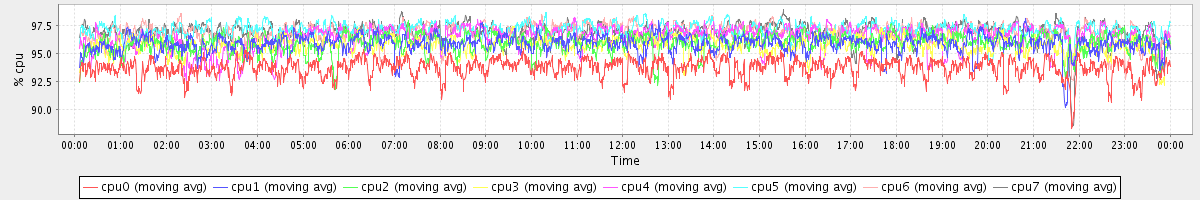 avg(cpu0) = 93.71 avg(cpu1) = 95.87 avg(cpu2) = 95.90 avg(cpu3) = 95.74 avg(cpu4) = 96.40 avg(cpu5) = 97.09 avg(cpu6) = 96.85 avg(cpu7) = 96.93