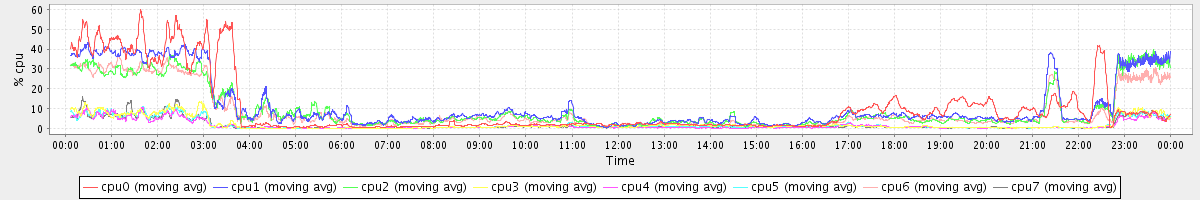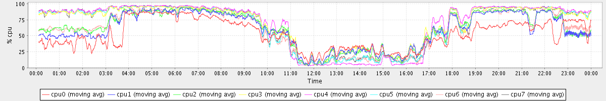 avg(cpu0) = 10.50 avg(cpu1) = 11.51 avg(cpu2) = 9.77 avg(cpu3) = 2.14 avg(cpu4) = 1.51 avg(cpu5) = 1.84 avg(cpu6) = 8.59 avg(cpu7) = 1.71