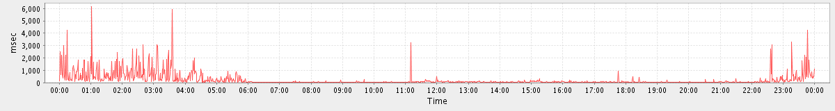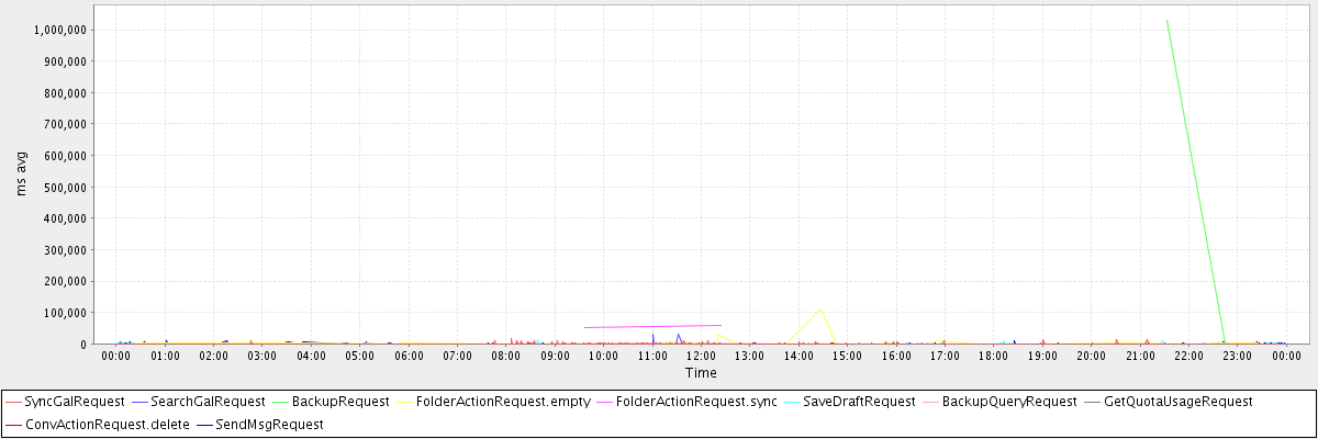 avg(SyncGalRequest) = 397.26 avg(SearchGalRequest) = 577.00 avg(BackupRequest) = 515471.00 avg(FolderActionRequest.empty) = 3563.77 avg(FolderActionRequest.sync) = 55438.50 avg(SaveDraftRequest) = 317.84 avg(BackupQueryRequest) = 1103.80 avg(GetQuotaUsageRequest) = 3484.00 avg(ConvActionRequest.delete) = 297.99 avg(SendMsgRequest) = 406.31