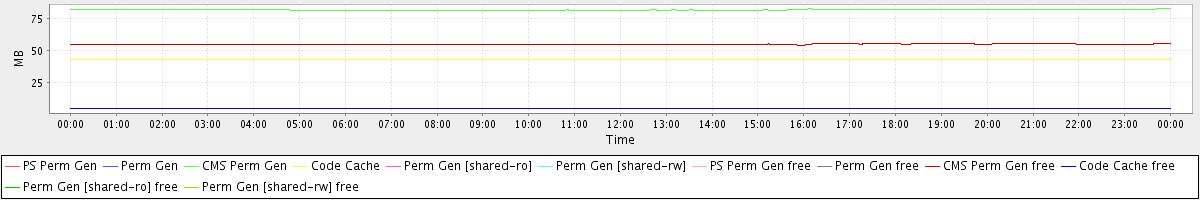 avg(PS Perm Gen) = 0.00 avg(Perm Gen) = 0.00 avg(CMS Perm Gen) = 81.65 avg(Code Cache) = 42.97 avg(Perm Gen [shared-ro]) = 0.00 avg(Perm Gen [shared-rw]) = 0.00 avg(PS Perm Gen free) = 0.00 avg(Perm Gen free) = 0.00 avg(CMS Perm Gen free) = 54.68 avg(Code Cache free) = 4.60 avg(Perm Gen [shared-ro] free) = 0.00 avg(Perm Gen [shared-rw] free) = 0.00