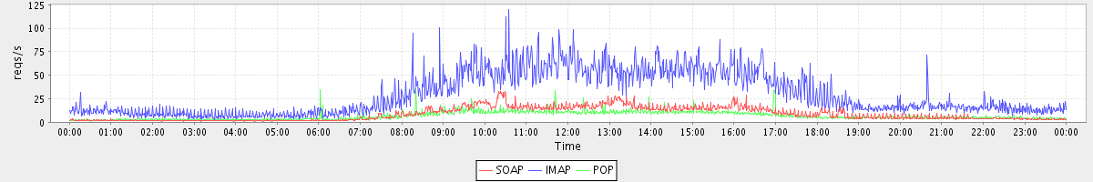 Host zm04.stanford.edu: Mailboxd: Request Rate by Client Protocol