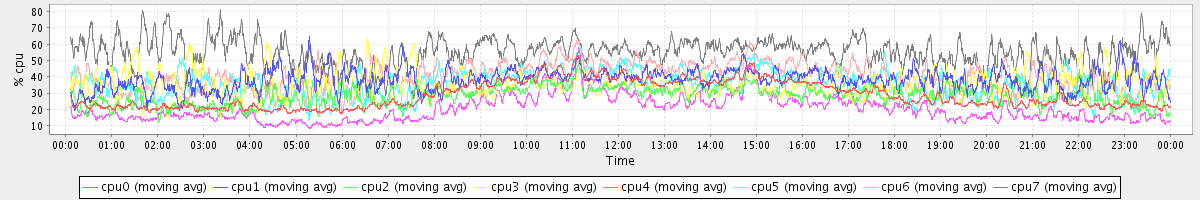 avg(cpu0) = 28.78 avg(cpu1) = 38.18 avg(cpu2) = 28.56 avg(cpu3) = 35.90 avg(cpu4) = 20.05 avg(cpu5) = 35.89 avg(cpu6) = 40.38 avg(cpu7) = 55.05